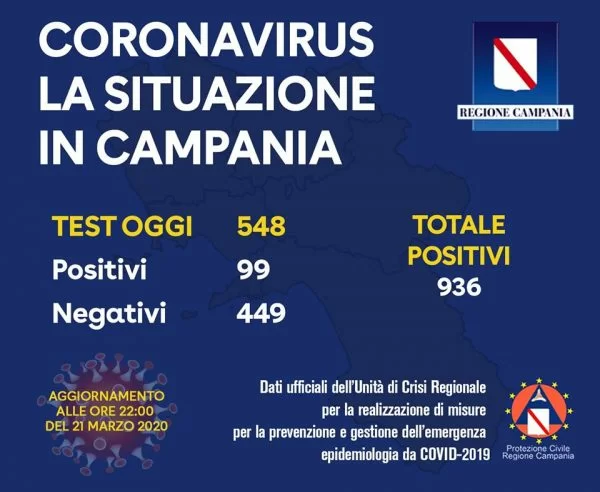 L’unità di crisi della Regione Campania ha evidenziato gli aggiornamenti sul contagio di Coronavirus nella regione campana. Nella giornata di oggi ci sono stati 99 casi positivi.