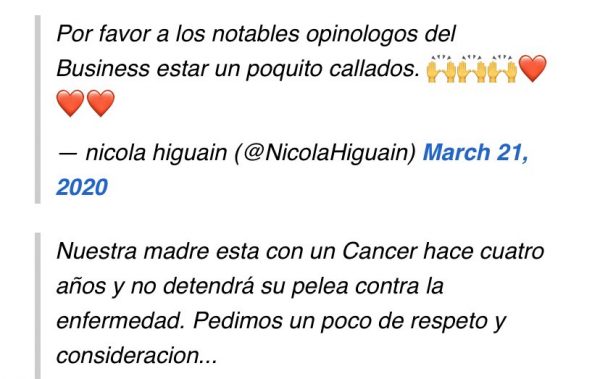 Nicola Higuain ha risposto su Twitter a tutti coloro che hanno criticato il fratello Gonzalo per aver violato la quarantena.