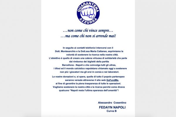 In seguito ai contatti telefonici intercorsi con il Dott. Montesarchio e la Dott.ssa Marta Cattaneo, esprimiamo la volontà di sostenere la ricerca nella nostra città. L’obiettivo è quello di creare una catena virtuosa di solidarietà che parte dal rimborso dei biglietti della partita Barcellona – Napoli e che coinvolga tutti gli ultras, i tifosi ed il mondo calcistico napoletano chiamato oggi a sostenere non più i giocatori ma gli eroi in corsia e nei laboratori.