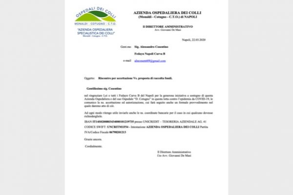 In seguito al comunicato da parte dei ragazzi della Curva B, il Direttore Amministrativo dell’Azienda Ospedaliera dei Colli Monaldi-Cotugno-C.T.O. di Napoli, Giovanni De Masi ringrazia e dà inizio alla raccolta fondi.