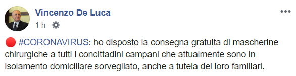 “Ho disposto la consegna gratuita di mascherine chirurgiche a tutti i concittadini campani che attualmente sono in isolamento domiciliare sorvegliato, anche a tutela dei loro familiari”.