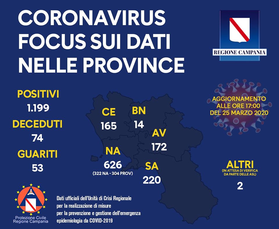 Pertanto il numero complessivo dei positivi in Campania è di 1199 così ripartito su base provinciale: