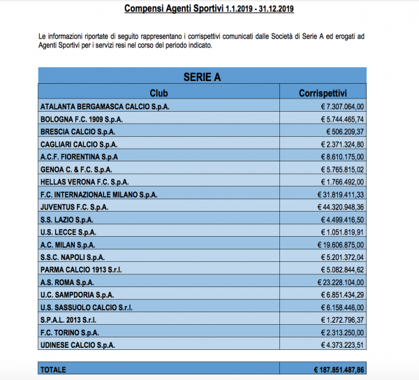 NOTIZIE SERIE A – La FIGC ha pubblicato sul proprio sito ufficiale le cifre delle commissioni che i club di Serie A hanno corrisposto ai procuratori sportivi nel periodo che va dal 1 gennaio al 31 dicembre del 2019. In totale sono oltre 187 milioni spesi dalle società del massimo campionato italiano.