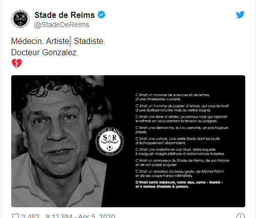 Nello specifico, lo Stade de Reims, club che milita in Ligue 1, che annuncia la scomparsa di Bernard Gonzalez, medico 60enne del club. L’uomo si trovava in quarantena insieme alla moglie anche lei positiva e deve non aver retto la pressione a tal punto da ricorrere al gesto estremo.