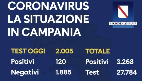 Nella giornata di oggi sono stati effettuati 2.005 test per il Coronavirus, di questi solo 120 sono risultati positivi, mentre ben 1.885 test hanno avuto esito negativo. Il bilancio totale dei positivi al Coronavirus in Campania sale a 3.268 casi, mentre il numero totale di test effettuati si attesta a 27.784.