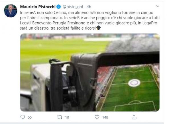 Il giornalista Maurizio Pistocchi, attraverso il suo account ufficiale di Twitter, ha rivelato che in Serie A, oltre al presidente del Brescia, Massimo Cellino, il quale, più volte ha ribadito la volontà di non tornare in campo dopo questa emergenza sanitaria dovuta al Coronavirus, ci sono almeno altri 5-6 club che non vogliono più giocare la stagione in corso.