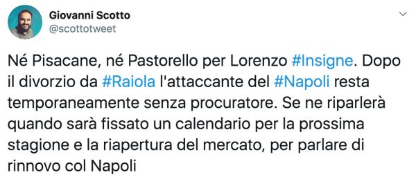 La notizia è però stata smentita dal giornalista de Il Roma, Giovanni Scotto, che su Twitter ha scritto un post in merito: “Né Pisacane, né Pastorello per Lorenzo #Insigne. Dopo il divorzio da #Raiola l’attaccante del #Napoli resta temporaneamente senza procuratore. Se ne riparlerà quando sarà fissato un calendario per la prossima stagione e la riapertura del mercato, per parlare di rinnovo col Napoli“.