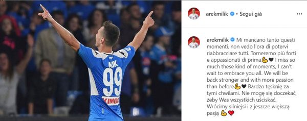 NOTIZIE CALCIO NAPOLI – Arek Milik, tramite il suo profilo Instagram, ha mandato un messaggio ai tifosi del Napoli. Il giocatore polacco, in scadenza di contratto a giugno 2021. Ecco le parole dell’attaccante polacco polacco: