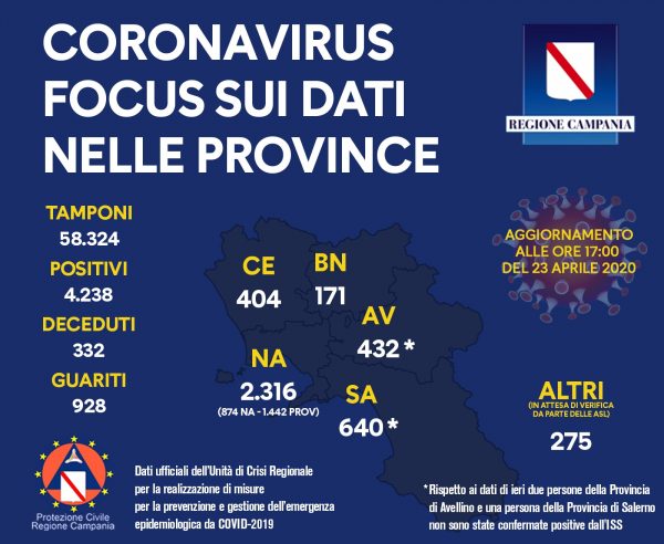 * Rispetto ai dati di ieri (aggiornamento del 22 aprile ore 17), 2 persone della provincia di Avellino e 1 persona della provincia di Salerno non sono state confermate positive dall’Istituto Superiore Sanità.