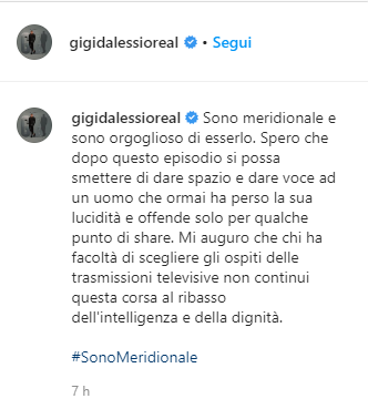 “Sono meridionale e sono orgoglioso di esserlo. Spero che dopo questo episodio si possa smettere di dare spazio e dare voce ad un uomo che ormai ha perso la sua lucidità e offende solo per qualche punto di share. Mi auguro che chi ha facoltà di scegliere gli ospiti delle trasmissioni televisive non continui questa corsa al ribasso“