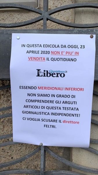 Sta spopolando sul web un annuncio fatto proprio da una persona del sud, che possiede un’edicola, il quale dichiara: “In questa edicola da oggi 23 aprile 2020 non è più in vendita il quotidiano Libero.