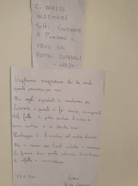 “Flavia vive a Castellammare di Stabia, con i due genitori: sono entrambi infermieri. Giovedì mattina il padre Alfredo ha trovato un biglietto anonimo nella buca delle lettere: ‘Ci farete infettare tutti, continuate a portare il virus dai vostri ospedali’. Alfredo Botta e Mena Gargiulo sono entrambi operatori sanitari e lavorano rispettivamente all’ospedale Santa Maria della Misericordia di Sorrento e al San Leonardo di Castellammare. La figlia Flavia una volta letto il biglietto e constatata l’ingiustizia di quanto scritto ha deciso di rispondere con la stessa moneta. Quando anche mamma Mena è rincasata dopo il turno di lavoro hanno risposto con un biglietto a loro volta”.
