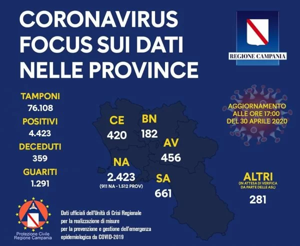 Totale guariti: 1.291 (di cui 1249 totalmente guariti e 42 clinicamente guariti. Vengono considerati clinicamente guariti i pazienti che, dopo aver presentato manifestazioni cliniche associate all’infezione virologicamente documentata da SARS-CoV-2, diventano asintomatici per risoluzione della sintomatologia clinica presentata ma sono ancora in attesa dei due tamponi consecutivi che ne comprovano la completa guarigione)