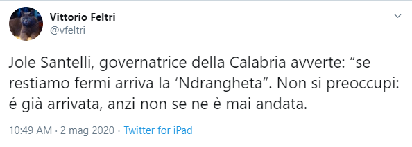 “Jole Santelli, governatrice della Calabria avverte: “se restiamo fermi arriva la ‘Ndrangheta”. Non si preoccupi: è già arrivata, anzi non se ne è mai andata”.