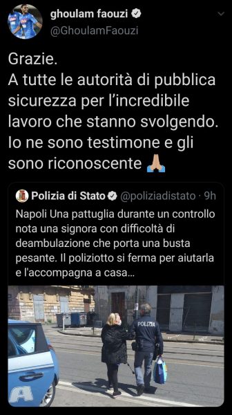 NOTIZIE – Il terzino sinistro del Napoli, Faouzi Ghoulam, tramite il proprio account Twitter ha ringraziato le forze dell’ordine per il lavoro che stanno svolgendo nel corso dell’emergenza Coronavirus. Ecco quanto evidenziato dalla nostra redazione: