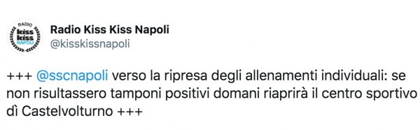 “Verso la ripresa degli allenamenti individuali: se non risultassero tamponi positivi domani riaprirà il centro sportivo dì Castel Volturno”.