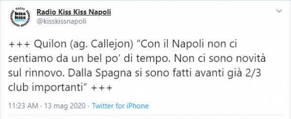 L’agente di José Maria Callejon, Manuel Garcia Quilon, è intervenuto a Radio Kiss Kiss Napoli per parlare del suo assistito. Infatti è sempre più in dubbio il rinnovo dello spagnolo con la maglia azzurra il cui contratto scade in estate. Ecco le parole dell’agente riportate anche dal profilo Twitter della radio: