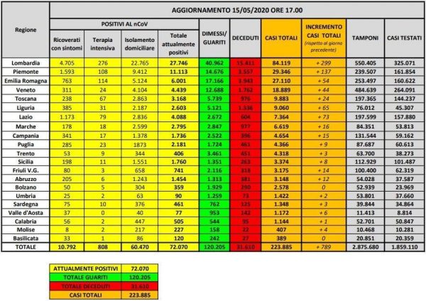 Il totale delle persone che hanno contratto il virus è di 72.070 unità, -4370 rispetto al dato di ieri. L’incremento dei casi è di +789 casi in un giorno (ieri il dato era di +992, due giorni fa di +888). Sono stati effettuati 68.176 tamponi in 24 ore (ieri il dato era di 71.876 test in un giorno).La percentuale di nuovi casi in base al numero di tamponi effettuati resta comunque positiva ed in linea con i giorni scorsi (ed è un buon dato essendo passati 12 giorni dal 4 maggio).