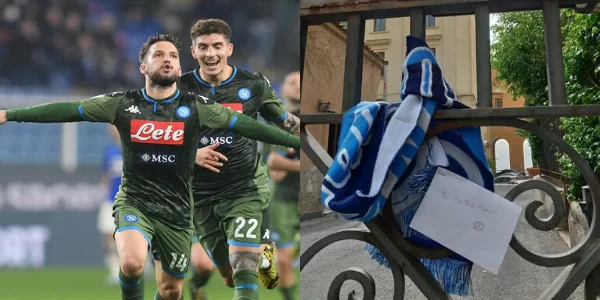 A Via Posillipo, infatti, un messaggio d’amore: una sciarpa rigorosamente azzurra e una lettera imbustata. Non se ne conosce il contenuto, ma il destinatario è scritto con cura ed eloquenza: “Per Ciro Dries Mertens”.