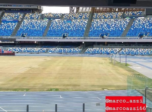 SAN PAOLO – Il giornalista Marco Azzi attraverso il suo canale Twitter scrive: “Al posto del prato c’è una gigantesca macchia gialla, ma in una decina di giorni l’erba del San Paolo ritornerà verde come prima“. Cosa è successo?