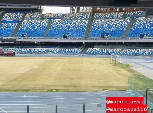 SAN PAOLO – Il giornalista Marco Azzi attraverso il suo canale Twitter scrive: “Al posto del prato c’è una gigantesca macchia gialla, ma in una decina di giorni l’erba del San Paolo ritornerà verde come prima“. Cosa è successo?