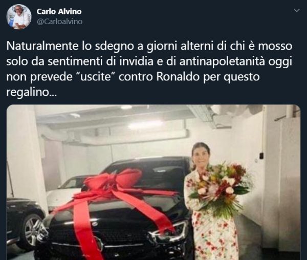 “Naturalmente lo sdegno a giorni alterni di chi è mosso solo da sentimenti di invidia e di antinapoletanità oggi non prevede “uscite” contro Ronaldo per questo regalino…”.