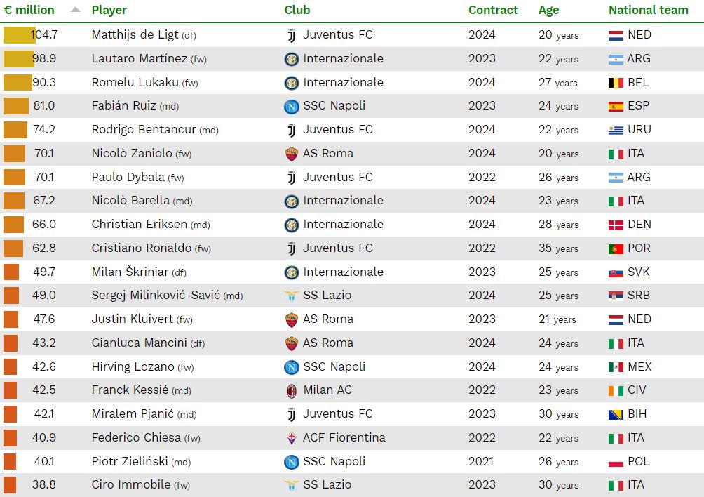 Al primo posto c’è un giocatore della Juventus, ma non Ronaldo: bensì De Ligt con un valore stimato di 104,7 milioni. A seguire gli interisti Lautaro Martinez e Lukaku, con rispettivamente 98,8 milioni e 90,3 milioni.