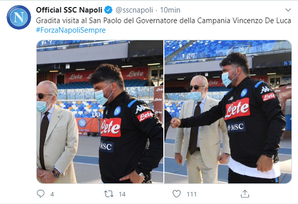 Il Napoli, tramite il suo profilo ufficiale Twitter, ha ricordato la visita di oggi di Vincenzo De Luca al San Paolo. Ecco le parole del tweet: