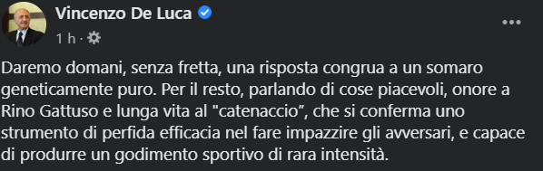 Il Presidente della Regione Campania, Vincenzo De Luca, tramite il suo profilo “Facebook” rinnova i complimenti al Napoli e Gattuso per la vittoria della Coppa Italia contro la Juve.