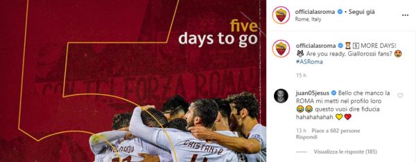 Infatti, la Roma ha cercato di pubblicare il countdown della partita contro la Samp, del 24 giugno, proponendo per ogni giorno il numero di maglia di un giocatore. Si è iniziati da Dzeko, che ha la numero 9, per poi arrivare al 5 che è il numero del brasiliano. Con suo stupore, la società ha deciso di pubblicare una foto di gruppo e non del singolo giocatore. Questo ha portato al commento ironico del giocatore, appoggiato anche da molti tifosi. Ecco le sue parole: