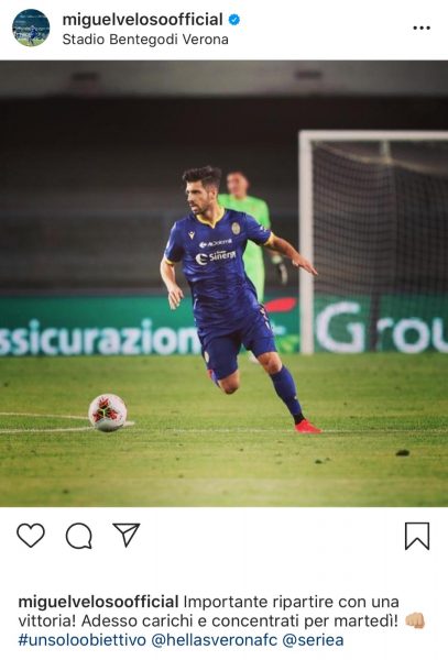Miguel Veloso ha un obiettivo contro il Napoli: vincere. Il centrocampista del Verona attraverso i social condivide il suo pensiero per la partita contro la squadra partenopea, che si terrà il giorno 23 giugno: “Importante ripartire con una vittoria! Adesso carichi e concentrati per martedì!“.
