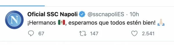 Anche la SSC Napoli, tramite il suo profilo Twitter spagnolo, ha mandato un messaggio di vicinanza alla popolazione del Messico: “Fratelli, speriamo stiate tutti bene!“. Questo il tweet arrivato dal club azzurro.