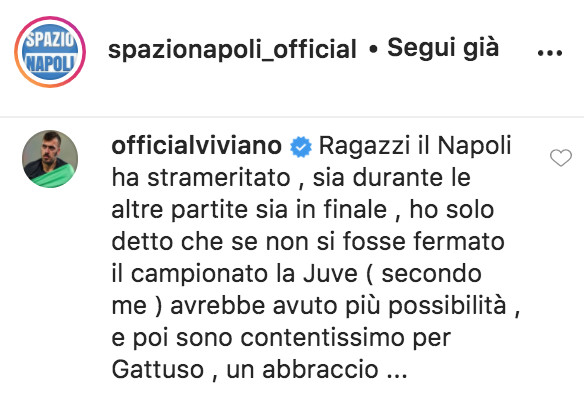 Ebbene il portiere ha voluto precisare quanto detto rispondendo ad un post sull’account Instagram di SpazioNapoli: “Ragazzi il Napoli ha strameritato, sia durante le altre partite sia in finale, ho solo detto che se non si fosse fermato il campionato la Juve (secondo me) avrebbe avuto più possibilità, e poi sono contentissimo per Gattuso, un abbraccio…“.