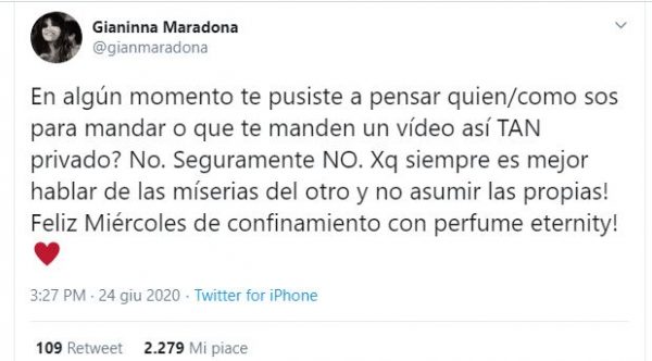 “Ad un certo punto hai iniziato a pensare chi / come stai per inviare o inviare un video come questo così privato? No. Sicuramente NO. Perché è sempre meglio parlare delle miserie dell’altro e non assumere le tue! Buon mercoledì di confino con il profumo dell’eternità”.