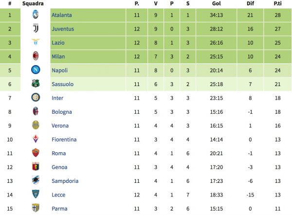 *In classifica mancano i tre punti del Napoli derivanti dalla vittoria di stasera.