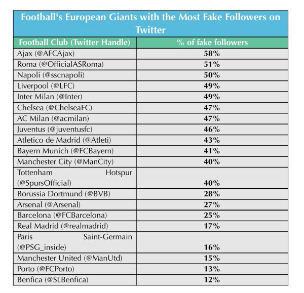 Secondo quanto evidenziato da un’indagine svolta dal portale Compare Bet e riportata su Twitter dal giornalista Kristof Terreur, molte squadre di calcio hanno all’interno dei propri follower dei profili fake. Lo studio evidenzia, tra le altre, anche la percentuale di “tifosi fake” del Napoli.