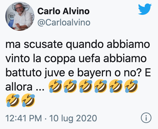 Carlo Alvino prova a lanciare un messaggio di positività ai tifosi su Twitter: “Ma scusate quando abbiamo vinto la Coppa Uefa abbiamo battuto Juve e Bayern o no? E allora…“.