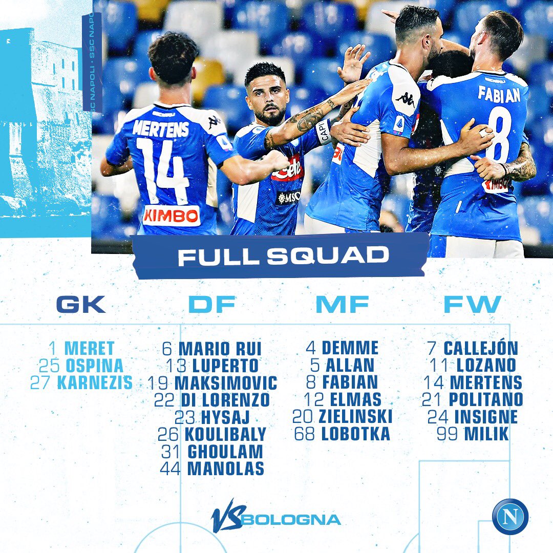 I convocati: Meret, Ospina, Karnezis, Di Lorenzo, Luperto, Mario Rui, Ghoulam, Manolas, Maksimovic, Hysaj, Koulibaly, Allan, Demme, Zielinski, Elmas, Fabian Ruiz, Lobotka, Callejon, Lozano, Insigne, Mertens, Milik, Politano.