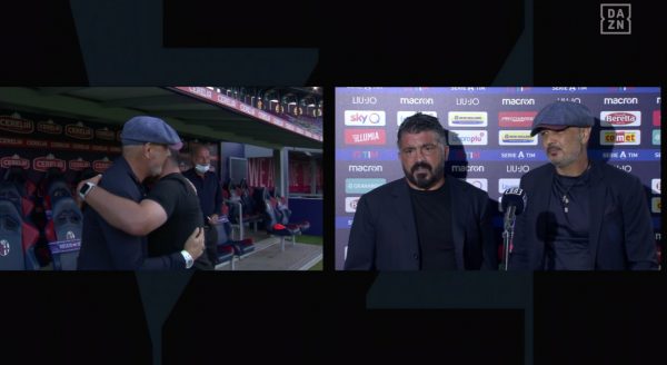 Rino Gattuso e Sinisa Mihajlovic infatti, dopo essere stati seduti entrambi in panchina nel prepartita, si sono presentati insieme per sostenere le interviste post partita ai microfoni di DAZN.