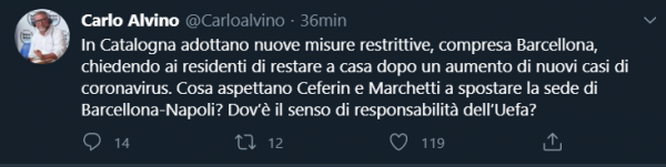 “In Catalogna adottano nuove misure restrittive, compresa Barcellona, chiedendo ai residenti di restare a casa dopo un aumento di nuovi casi di Coronavirus. Cosa aspettano Ceferin e Marchetti a spostare la sede di Barcellona-Napoli? Dov’è il senso di responsabilità dell’Uefa?”.