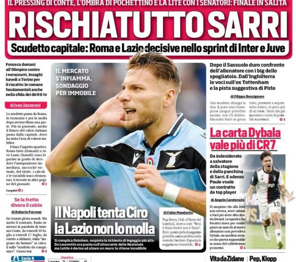 La prima pagina de “Il Corriere dello Sport” in edicola domani, in prima pagina parla del mercato del Napoli e dell’interesse degli azzurri per Ciro Immobile della Lazio. L’articolo di apertura titola così: “Il Napoli tenta Ciro, la Lazio non molla”.