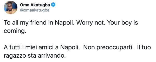L’ormai noto Oma Akatugba, giornalista nigeriano ed amico di Victor Osimhen che è stato nostro ospite qualche giorno fa, ha fatto sognare ancora una volta i tifosi del Napoli. Il giornalista, da tempo ormai certo dell’arrivo di Osimhen al Napoli ha postato un particolare contenuto sui social.
