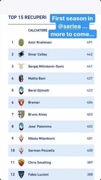 Numeri incoraggianti per il Napoli. Amir Rrahmani, l’acquisto del club azzurro durante il mercato invernale ha condiviso sui social la classifica dei top 15 giocatori con i loro recuperi palla. Il difensore kosovaro ha iniziato a giocare in Serie A dall’anno 2019.