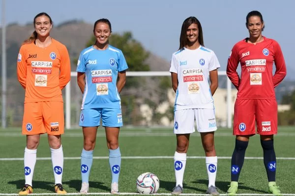 La maglia azzurra – del resto – è un’icona per la città di Napoli, un simbolo per la tifoseria. Così, è stato scelto il colore del cielo e del mare per le partite casalinghe mentre per la seconda maglia ecco un classico bianco “da trasferta” (indossato da Federica Cafferata) e per i due portieri (Mainguy e Perez) colori sgargianti. Sulla spalla di Isobel Dalton, infine, la patch della Serie A.