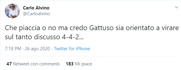 Il collega Carlo Alvino ha ipotizzato il possibile modulo che Gattuso utilizzerà in campo. Sul suo profilo Twitter, parla di un impiego del 4-4-2 nella prossima stagione. Ecco di seguito il tweet: