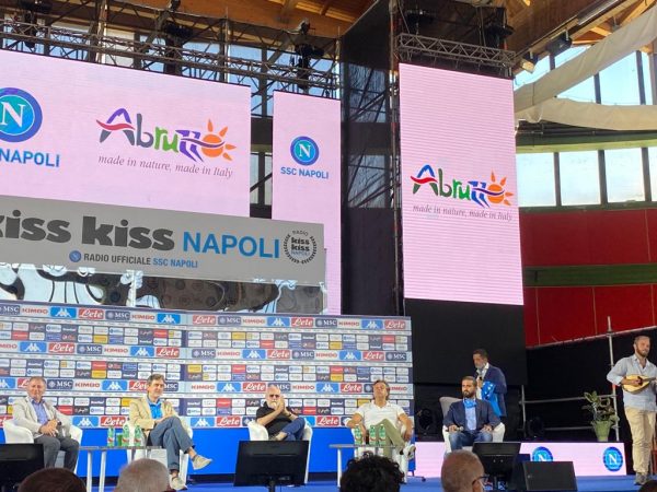 Momento di spettacolo a Castel di Sangro prima della conferenza stampa di fine ritiro del Napoli. Sul palco del palazzetto dello sport è infatti salito un artista con mandolino che ha allietato i presenti con due canzoni di augurio per la stagione dei partenopei.
