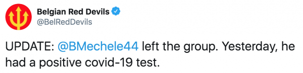 Infatti, come comunicato dalla federazione belga su Twitter, Brandon Mechele è risultato positivo ad un controllo. Il calciatore ha lasciato il ritiro della Nazionale dove, tra gli altri, c’è anche il napoletano Dries Mertens.