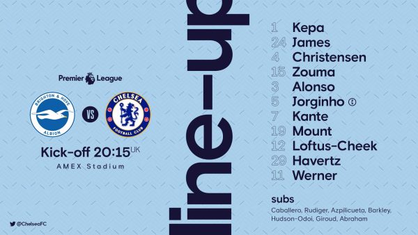 CHELSEA (4-2-3-1): Kepa; James, Christensen, Zouma, Alons; Jorginho, Kante; Mount, Loftus-Cheek, Havertz; Werner.