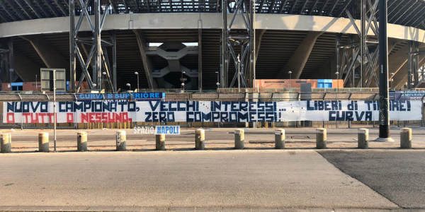 “Nuovo campionato, vecchi interessi. O tutti o nessuno, zero compromessi”, recita lo striscione a Fuorigrotta.