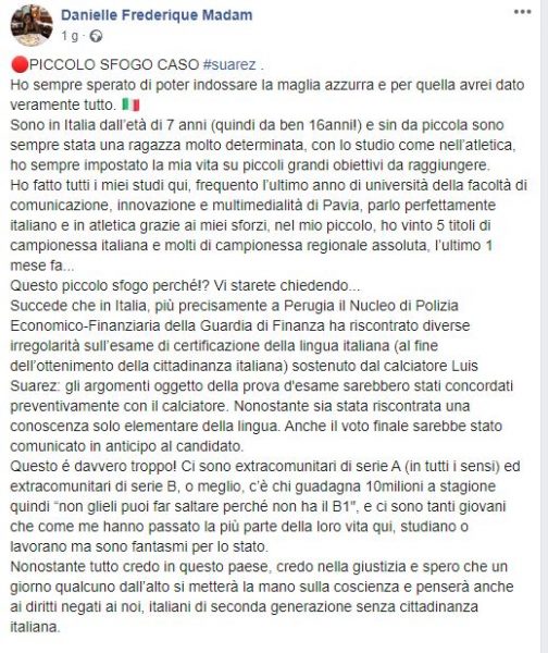 Danielle Fréderique Madam alza la voce e lo fa attraverso Facebook. La campionessa italiana di lancio del peso, nata da genitori camerunensi, ma dall’età di 7 anni in Italia, dopo il caso Suarez, si sfoga perché non può indossare la maglia della nazionale italiana perché non ha diritto di cittadinanza: